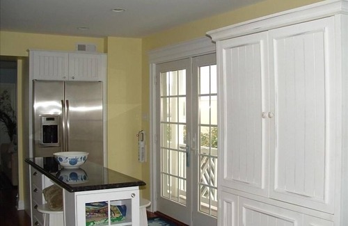 The gorgeously appointed kitchen finished in blue granite that features a lighted island. A white coral chandelier hangs over the dining room table while French doors onto the deck invite you to enjoy your morning coffee. Entertain with beautiful serving pieces that decorate the shelves and are left for your use. Washer and dryer are in a room off the kitchen.