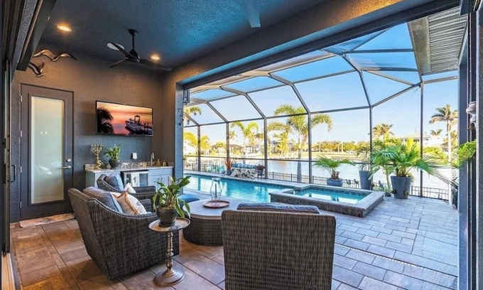 Best-rates for the Burnt Store Isles house starts from $406 per night with includes Laundry, Parking, Pet Friendly, Pool, Security/Safety, Bedding/Linens, Barbecue/Outdoor Cooking, Child Friendly, Internet, Air Conditioner, TV, Balcony/Terrace, Fireplace/Heating, Kitchen StayAndPlay offers fully equipped golf villas, golf hotels, golf resorts, luxury golf cabins, and exclusive golf retreats, making it easier than ever to find your perfect golf escape — ideal for families, peaceful getaways, or pet-friendly retreats with the whole crew.