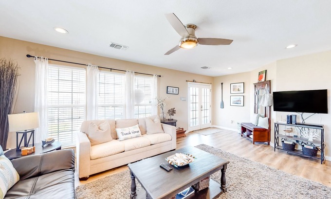 Unwind in the chic living area, outfitted with a sofa, sleeper sofa, and 40-inch smart TV. A shiplap accent wall adds a touch of coastal flair. Channel your inner chef in the retro-inspired kitchen. Black and white tiling, stainless steel appliances, soft-close drawers, and new quartz countertops make this space a delight. When it’s time to eat, share meals at the stylish dining table for four or at the breakfast bar.
