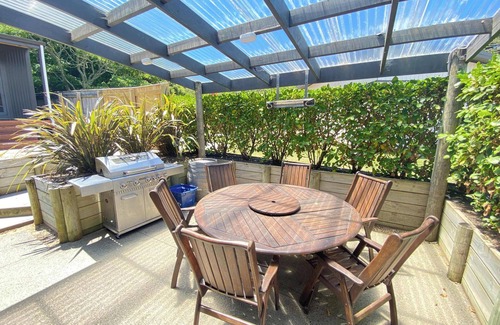Enjoy the generous outdoor patio, complete with a large table, seating, and a BBQ for alfresco dining. Additional perks include a washing machine, dryer, and free parking on the premises. Whether you’re a couple, a group of friends, or a family with older children, this inviting beachside retreat in Golden Bay promises a relaxing and memorable stay.