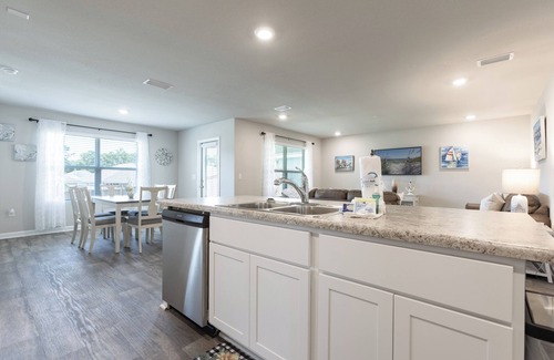This home is adorned with coastal decor throughout with all new furniture, window treatments, mattresses, and bedding. The Remote Primary Suite entails King Size Bed, a wall mounted Smart TV, a Private Bath with a relaxing Garden tub, Separate Shower, and a huge Walk In Closet. Guest Bedroom #1 holds a Queen Size Bed and a wall mounted Smart TV. Guest Bedroom #2 is perfect for the kiddos with a Twin over Full Bunk Bed with another Twin Pull Out, and a wall mounted Smart TV for their favorite shows. Just between the 2 Guest Bedrooms is the Full Size Guest Bath with a shower/ tub combo and a closet full of extras such as Beach Towels, Games, and more! With an open floor plan, the entire family can gather in the great room to watch the game on the large screen, wall mounted, Smart TV, while you (or designated vacation chef) whips up a fantastic meal in the fully stocked kitchen, with a provided k-cup coffee brewer. There is even a sleeper sofa in the living area for extra sleeping arrangements. Parking is a breeze with a 2 car garage and can fit up to 2 more cars in the driveway.