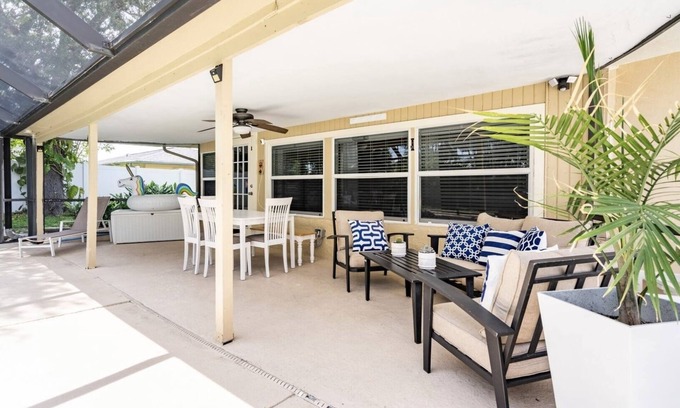 Relax in a coastal getaway! Split floor plan, 3-bedroom, 2-bathroom Fort Myers vacation home with an added sunroom. The house has a screened lanai with a pool & spa (UNHEATED), complete with relaxing pool chaises and an outdoor dining area to help you enjoy the gorgeous Florida weather. Centrally located in the heart of Fort Myers, you are close to everywhere you would want to go including: Fort Myers Beach, Sanibel, downtown, the airport, shopping centers, restaurants, and more.