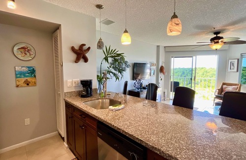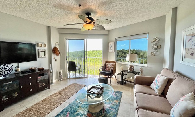 This charming 2 bedroom, 2 bath top floor condo offers a great open concept living area, spacious master suite, comfortable guest room and two private balconies overlooking the marina, protected mangrove preserve and Atlantic Ocean. Complete with fully equipped kitchen, beach towels, and Keys-y décor, this condo has everything you need to make your vacation one to remember.
