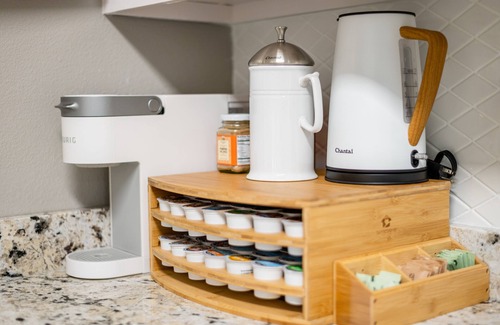 The fully equipped kitchen has everything you need to prepare your meals, including some tantalizing spices! To get your mornings off to the perfect start, we offer a full coffee station with both a French Press and a Kuerig and plenty of coffee flavor choices!