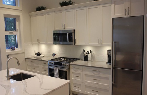 The guest house, although only 545 sq ft has 12 foot ceilings, with a wall of windows that make it very bright and spacious. All the floors are radiant heated with separate zones in each room. The kitchen is equipped with new Bosch appliances, including a dishwasher and natural gas stove, micro wave and fridge. There is also a clothes washer and dryer for your convenience. All counter tops are quartz stone, with the island having a seating area for meals.There is a leather sectional couch and a 42" TV perfect to curl up and watch cable,or Netflixs. Wifi is included.