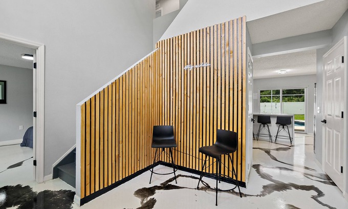 Walking in, there is a beautiful accent wall greeting you with a sign 'Stay Awhile'. The custom floor pattern flows from one room to the next! On one side is the pool table/air hockey, on the other is the king bed room with easy access to the bright half bathroom, convenient for an elderly/disabled traveler who prefers to stay on ground level.