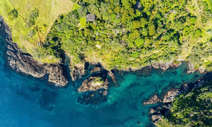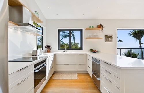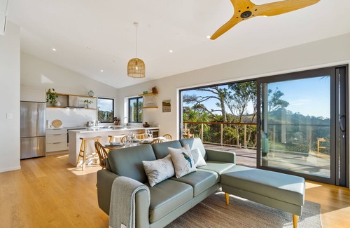 The expansive elevated decking puts you amongst the canopy of trees and surrounds the interior with an al fresco dining area and outdoor shower. Spectacular views up the coast and out to the Poor Knights Islands.