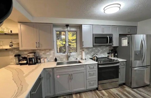 3 bedrooms (king-2nd floor, queen-main floor with twin pull out loveseat, full over full bunk bed w/twin trundle 2nd-floor). 2 full bathrooms. Main floor bathroom has single stall shower and upstairs bath has tub with shower. High ceiling in living area with adjoining dining area with pub height table and kitchen bar area that's open to kitchen. Large deck out the slider in dining area. Off the kitchen is a laundry room and mud area. Pets are welcome!