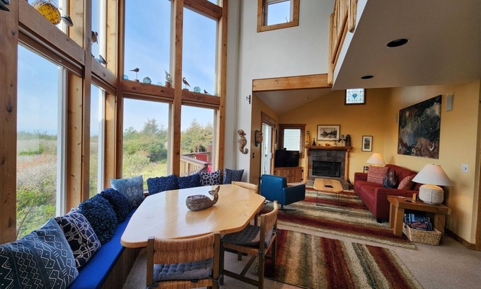 Cozy up in this lovely three story in Ocean City just 7 miles north of Ocean Shores, hand-crafted home with many architectural delights. Enjoy the native decor and carvings, log bed, and stained glass windows. There are 2 bedrooms, one with a queen bed and one with a full bed, an open loft with a queen bed and a family room with two twin beds. There are two full baths, one with a jetted Jacuzzi tub and a half bath. The livingroom, kitchen and dining area, and the loft bedroom all have an ocean view. You can sit around the fire in the evening and enjoy a sunsets