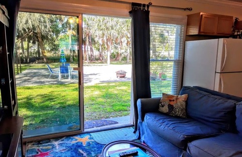 I think you will like my place! Its decorated like a beach house located in a tropical atmosphere with over 39 large palm trees, & lots of banana trees & thick green grass in the summer. You may see various wildlife that live along the creek bank like Raccoons, turtles, otters & Great Blue Herons! Im close to restaurants, nightlife, Historic sights, hospital (<10 min), shopping & FLETC (<3min). St Simons Island is about 15 minutes away & Jekyll Island about 25 minutes. Its a nice "simple" casual place. You have CH&A, full kitchen, washer & dryer, starter coffee, tea, sugar ect , all the basics you need. The bed is queen size, and the blue jean couch is comfortable. Its located on a tidal creek that's about 4' @ high tide & 0' @ low tide. Guests have access to the breezeway connecting the unit to my house where I have a patio table & 4 chairs & a charcoal grill, the hammock gazebo area next to the creek, the area immediately behind the unit w/table, chairs & umbrella & in the unit itself. Any other part of the property is my private area. Theres a wifi lock on the front door. Older established neighborhood with huge moss covered oaks & long winding roads. Its usually pretty quiet, BUT there can be the usual noise because humans live, work & play around here. Theres historic sites nearby, and lots of salt & freshwater waterways if you like boating, crabbing & fishing! Were not a large town, so you can mostly get anywhere in 30 minutes or less. I have a black doggy named Willow who may come by for a visit. She is a very friendly Staffy mix, but if you dont want her company let me know! Discounts for weekly and monthly stays.