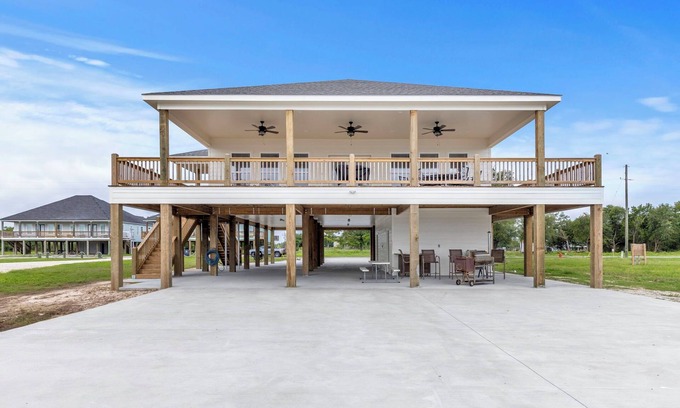Custom built waterfront home on the Calcasieu Ship Chanel is ready for your next vacation! Accessing the property by water or vehicle is very convenient due to its perfect location. Spicer-Hughes Marina is less than a mile away and offers live bait, fuel and a boat ramp. The interior of the home offers full baths in each bedroom, TVs in each room, expansive dining areas for enjoying meals and plenty of room to lounge and relax. The exterior of the property spared no expense. There is ample concrete for parking vehicles, boats and trailers. 1 full RV hook-up is available for an additional fee of $100.00 per night. If you love to entertain outdoors, look no further. Prepare any meal on the large BBQ pit, smoker/grill or Blackstone griddle then serve on the two picnic tables and other outdoor seating areas while watching the ships and boats pass by the house. Guests have the luxury of using the dock, slip and lift to make your fishing experiences more accommodating and stress-free.