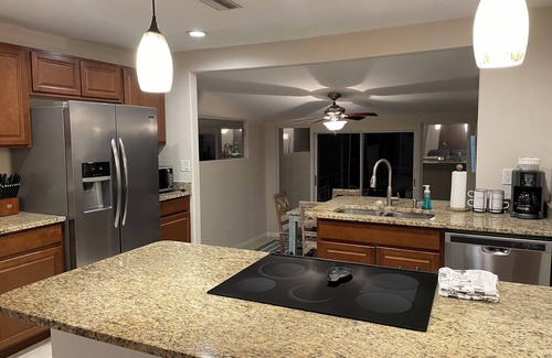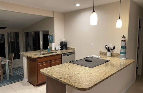 No hurricane damage to this house! Beaches and restaurants are open!! Hop in your golf cart or on your bike to make the short trek to beautiful Nokomis Beach. Tourists and locals gather at the jetties to watch the sunset every night. After a day at the beach, cool off in the refreshing pool right in the backyard.