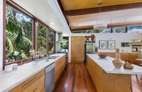 The property has abundant windows framing lush green views and creating a feeling of living among the treetops. It has four bedrooms, a stunning gourmet kitchen flowing to the balcony and dual lounge areas with pool table and plenty of room to spread out.