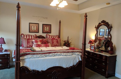 The upstairs level of our beautiful home has a fully equipped kitchen🍽️ living room, dining room with bar area 1-1/2 baths, utility room with washer & dryer and the master suite. The master suite has a king bed and a master bath that has a double vanity, whirlpool tub and separate shower. The Master Suite also has french doors that open out to a balcony to enjoy your morning coffee in the sunshine🌞 and enjoy peacefulness by the lake.