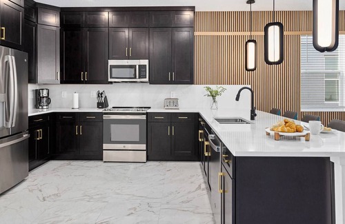 Whether you’re whipping up or warming up your vacay meals, this masterful Kitchen will help you handle it all with ease. The cabinets and drawers are fully stocked with tableware and cookware. The gadgets and appliances allow for all kinds of cooking (or reheating). And the large black island–which doubles as a breakfast counter with 5 comfy stools–offers a ton of space to prep or lay out a spread.
