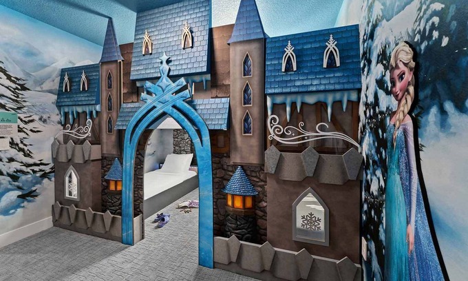 (4 twins) Magnificence meets cozy charm in this fabulous ‘Enchanted Castle’ themed bedroom, which features two bunk beds tucked inside a majestic snow palace. The windows and blue-gray exterior are coated in a glistening layer of ice and snow, while delicate snowflakes dance upon the window panes–creating a wintry ambiance. All around the bunk beds, lifelike wall art transports you to a snowy wonderland, featuring breathtaking snow-capped mountains, sprawling white plains blanketed in a pristine layer of snow, and pine trees gracefully adorned with a touch of frost. The room exudes a grand yet irresistibly cozy vibe, inviting little ones to feel like real princes and princesses surrounded by the magic of this dreamy castle.