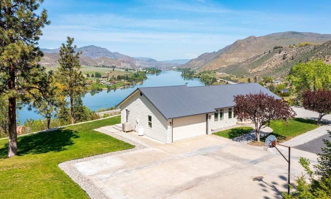 Treat your family or group to panoramic mountain & river views at this 5 acre Columbia River Retreat with park-like grounds including a huge yard, newly installed in ground heated pool, large patio area with dining, outdoor swingset & basketball hoop! This incredible rambler has been freshly-renovated with a sophisticated blend of modern and luxurious design. Relax to a custom electric fireplace in the large open concept living area, dine in the chef's kitchen & enjoy a huge outdoor patio area w/ bbq, cabana, heated pool & private hot tub! Enjoy privacy & luxury living 7 miles to chelan!