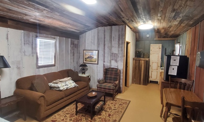 Located 2 miles from downtown Mason square. Guests have 2 cabins to choose from or both! This listing is for Cabin #1 which is 14x36 in size. It has metal roof walls & wood slat ceiling. Guests have access to a kitchenette with microwave, sink & small fridge. The bathroom has a walk-in shower, sink & electric toilet. (Yes electric toilet.) Cabin sleeps up to 4 people with a king size bed & a sofa sleeper. Cabin has a front porch and sitting area to enjoy outdoors. Cabins have a private entrance & each cabin has its own parking. A/C & Heat for your comfort along with hot & cold water. Guests will have access to TV with Dish Network . Cabins are in a fenced in lot on private property & guest can walk around inside this lot only. We live next door to cabins for any assistance you may require. Cabin doors are keyed and can be located in arrival instructions. Around the cabins are trees & brush that contain local wildlife. Be aware of your surroundings when on the property. There is some noise from neighbors & highway, but still nice & quiet getaway. Cabins are spray foam insulated for comfort & sound. Neighbors have dogs & goats, please do not feed the animals.