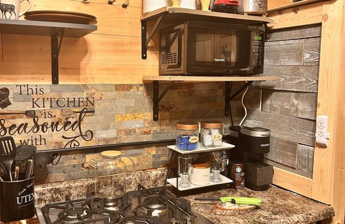 Hot tub or just perfect for a good night’s sleep. Listening to wild life lakes and restaurants near by casino very secluded area and relaxing. Enjoy night time lights landscape There is no running water but there water in kitchen bring your own drinking water.The inside tub its in a process can not be used this time.There is outdoor shower water will be provided. Enjoy the fireplace with light ambience cracking sound for extra warmth and a split unit for heat/AC. There is loft with ladder and also loveseat can be bed if you choose not to go to loft. Hot tub is all year round and its monitored by WiFi to make sure it’s at 85F you can adjust the temperature but don’t turn off.Once done using please cover the hot tub and The split unite is at 70 our guest stay comfortable. There is camera facing the gate for the safety of our guests. If for some reason breaker go out there is fuse box back of cabin and once reset make sure the hot tub is on and you hear the noise.if you just leave it like that it will loose the heat and it will cost additional charges. Please wipe your feet when entering the hot tub. When done cover the hot tub the code for cabin will be sent out an hour before check in thank you for checking us out and hope to see you in our cozy cabin.