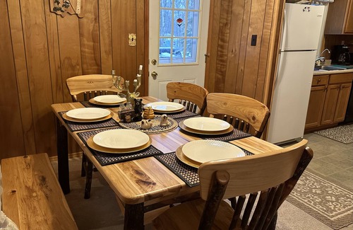 Wrapped around the corner separate kitchen room with breath taking view through window. Breakfast dining forest touch log dining table with seating for 6. Gather around and enjoy your home cooked.