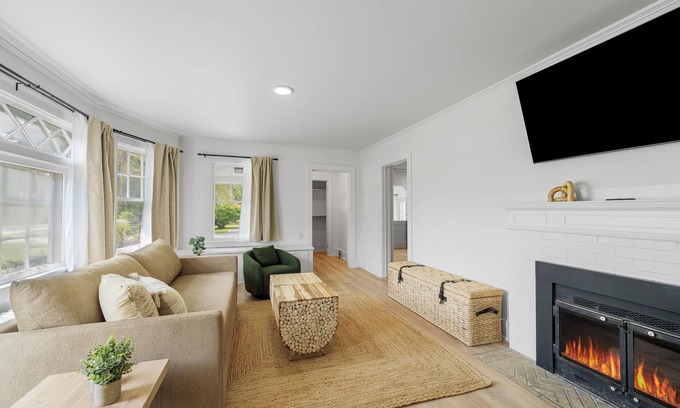 Our completely renovated Guesthouses provide comfortable and spacious accommodations for a weekend getaway or multi-week visit. Guesthouse B accommodates up to four guests and features private bedroom with king size bed and a queen size sleeper sofa located in the living room. The bright and spacious living room boasts a cozy gas fireplace and large flat-screen web-enabled TV with complimentary access to Disney+, Hulu, and ESPN+. Guesthouse B provides one bathroom, a kitchenette with full-size refrigerator, sunroom/dining area, and dedicated office area.