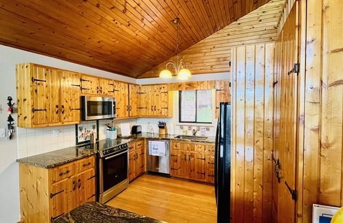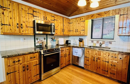 Blue Heron Hideaway is an Upscale 3BR, 3BA Home in a Quiet Wide Water Cove with deep, clean water (1 King, 2 Queens). All Bathrooms are tiled: The Master Bathroom features a jetted soaking tub and separate tiled shower, the main level bath has a tub/shower combination and the lower level bath is well-appointed with a stand-up shower and linen closet. All rooms are beautifully decorated, furnished and appointed with granite, hardwood, solid wood doors and tile throughout. The open concept floor plan combines the kitchen, dining and living areas while enjoying the view through floor-to-ceiling windows of the A-Framed Great Room. The 1600 square foot dock area has both fixed and floating docks with plenty of shade and opened areas. Two kayaks and a paddle board are available for your use. There are infant, child and adult life jackets to use with all water toys.