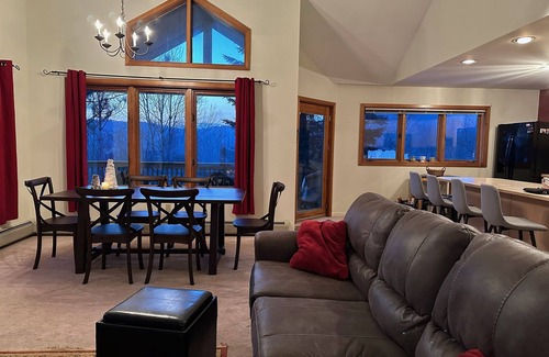 Hike right out your back door! Enjoy a beautifully furnished large open living space with cathedral ceiling and cathedral windows with sunset views. Keep warm by the fireplace (wood included) and take advantage of the fully equipped kitchen. Enjoy 2 large bedrooms, each with a full private bath. Master bedroom includes a jacuzzi tub.