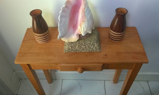 The interior is adorned with island style pictures on the stairway, inclusive of a hanging quilt made by a Youth Club of young persons from South Eleuthera. Additionally, there are other framed pictures on the walls.