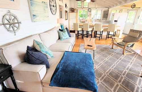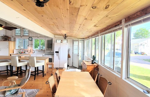 This large open concept cottage has newly installed 12in wood floors freshly painted,clean.With a very Scandinavian feel. Almost all Ikea newer furniture and bedding. Come relax on the beach . There a couple of bikes to use, along with a paddle board. There is a Queen in the main bedroom , each of the other 2 bedrooms have a full/twin bunk bed set up. The deck is very large and over looks both sides of the lake,great for a barbeque.