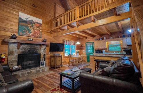 This beautiful log cabin, with gorgeous pine flooring is the star of the area with modern upgrades. Relax outside on the porch, in the jacuzzi, or around the fire pit with a glass of complementary wine. Pike's Peak has a fully stocked kitchen to prepare full meals for the family. This beautifully cabin is located in a picturesque setting, perfect for enjoying a quiet evening on the front porch, or grilling on the charcoal grill. Relax with the whole family at this peaceful place to stay.
