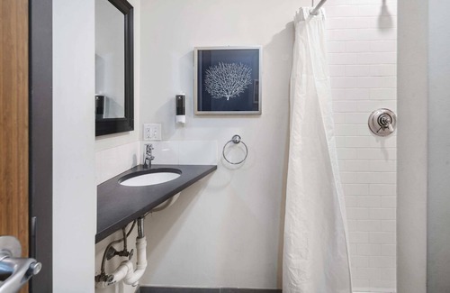 This efficiency suite features a fully-equipped kitchenette and living area. The flooring is carpeted throughout, with ceramic tile in the bathroom. This unit has central heating and cooling that is controlled via a thermostat in the unit. The bed area features a queen over full bed, full-sized desk, reading lamp and USB alarm clock. The bathroom has a beautiful, white tile enclosed shower. The flat screen HD Smart TV (making watching programs like Netflix a snap) is equipped with local channels and HDMI inputs that can be used to connect a computer to view online content.