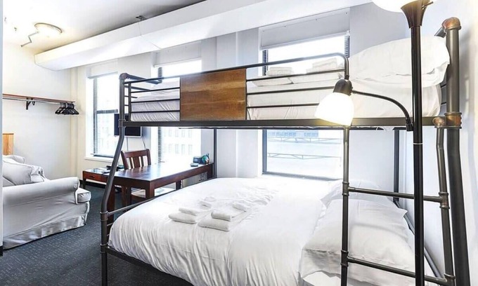 The room comes with a bunk bed that has a full size bed over queen size bed. Its most comfortable for 3 adults but can sleep 4!