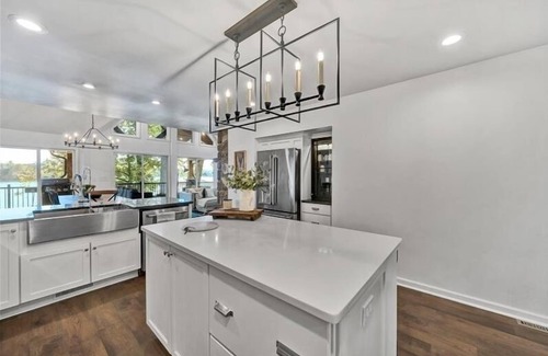 Main level has a great room - beautiful kitchen with upgraded appliances (including gas cooktop) and quartz countertops (please be sure to cleanup any spills!). Living room has SmartTV. Expansive windows & vaulted ceiling allow for lots of natural light. Spacious deck looks out to the lake and offers outdoor furniture and a gas grill.