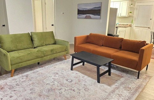 Relax and unwind in the cozy open-concept living space, featuring plush seating, a smart TV, and plenty of natural light. Whether you're enjoying a movie night or simply relaxing after a long day of exploring, this space is designed for comfort and connection.