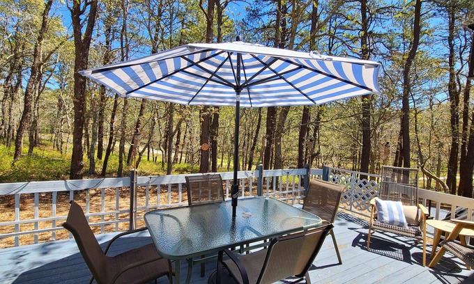 This comfortable three-bedroom home with central air conditioning, is situated on a lovely one-acre wooded lot in a quiet neighborhood on Wellfleet's oceanside abutting the Cape Cod National Seashore. Follow the trail to Gull Pond--approximately 0.5 mi.