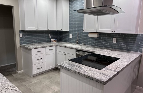 Absolutely beautiful kitchen with tall shaker cabinets, granite counter tops, high-end appliances, and large deep basin sink. Kitchen is fully stocked with just about any kitchen gadget imaginable including blender, coffee maker, toaster, crock pot, instapot, pots, pans, dishes, silverware, high quality knives, and lots more.