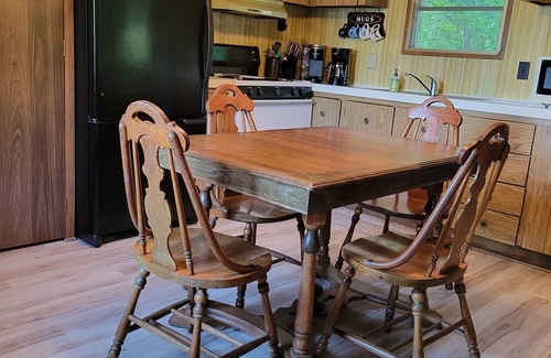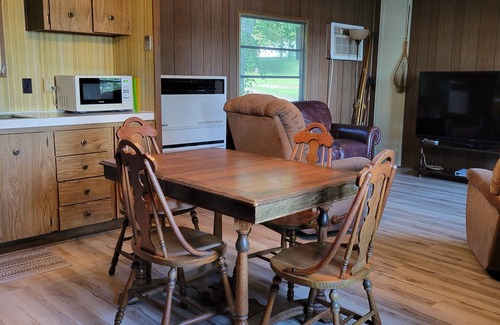 Nestled in the woods. Two-bedrooms, sleeps five. Just a few steps to the lake shore. Fishing and water sports. Washer and dryer (new addition May 2025). Air conditioning and furnace. Open living, kitchen and dining space. 60" flat screen TV with internet and streaming options. Two small decks, charcoal and gas grill, outdoor table and a picnic table. Portable wood fire pit and a fire ring located close to the beach, firewood. 3 kayaks, dock, sandy beach & shallow swim area. Pet friendly.