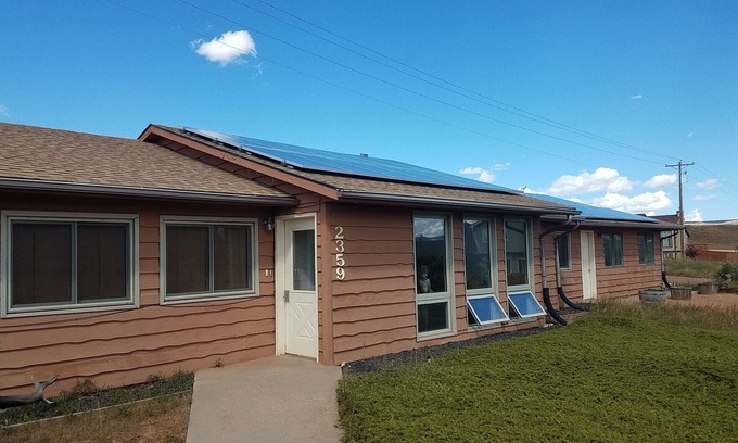 This comfortable 3 bedroom, 2 bathroom, solar electric house is located on the north edge of Laramie, nestled into the hillside in a quiet neighborhood with shared open space and paved green-belt trail just up the hill for walking, running or biking. From the top of the hill, you can see the Snowy Range to the west, the Laramie Range to the east, and the mountains of Rocky Mountain National Park to the south. With its 360 degree views, this is a great place for viewing sunsets or sunrises and watching the weather.