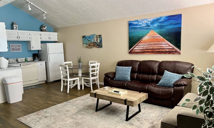 This cozy unit includes a 70" TV with Roku built in (living room) and a 42" full motion mounted TV (Bedroom). Fully functional kitchen for dining in, full sized shower with large bathtub and double vanities. Free 293 mbps WIFI. Very comfortable king bed as well as a queen sofa sleeper and a single cot. A pack and play is also provided.