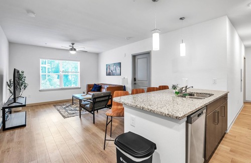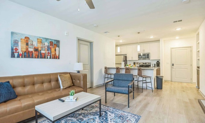 Step into style and comfort with thoughtfully designed spaces featuring luxurious wood-style flooring, stainless-steel appliances, and stunning tile backsplashes complemented by sleek granite countertops. Each home boasts high-powered Wi-Fi, a deluxe 65” flat-screen TV, and contemporary furnishings. Soaring nine-foot ceilings, designer lighting, and ceiling fans create an airy and inviting atmosphere.