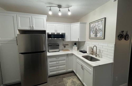 Private entrance to this studio. Includes a king OR twin beds, kitchen, bathroom with shower, AppleTV, dinette, full size refrigerator, microwave and Keurig coffee maker and kettle. The kitchen has a sink but does not have a cooktop. Outside the studio there is a large patio with chairs to enjoy your morning coffee.