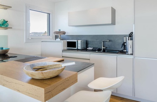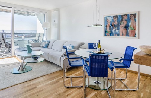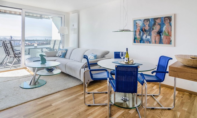 Overlooking the lake, the vacation apartment 'Bodenseepanorama Oberuhldingen' in Uhldingen-Mühlhofen impresses guests with its fantastic view. The 85 m² accommodation consists of a living room, a fully equipped kitchen with dishwasher, 2 bedrooms with beds for allergy sufferers and a bathroom with free-standing bathtub as well as a guest toilet and thus offers space for 4 people. The amenities also include Wi-Fi, two flat-screen TVs with streaming services, a fan, a washing machine and a dryer. A high chair for children is also available. The apartment also offers a private balcony, with breathtaking views of Lake Constance and where you can watch the beautiful sunsets in the evening. Furthermore, the apartment offers a fantastic view to Constance, to the island of Mainau and over Lake Überlingen. Other highlights of the apartment include a large indoor pool, a table tennis table and a sauna. The vacation apartment Bodenseepanorama is surrounded by a well-kept green area in Uhldingen-Mühlhofen. The accommodation is 5 km from Meersburg and 10 km from Überlingen. You benefit from free Wi-Fi, a covered parking space for one car and for bicycles is available at the accommodation. Additional free parking is available on the street. Look forward to relaxing hours in a quiet atmosphere. Constance is 10 km from the accommodation and Lindau can be reached after 39 km. The nearest airport is Friedrichshafen, 22 km from Ferienwohnung Bodenseepanorama. Unteruhldingen lido 1.8 km Tractor Museum Mühlhofen 1.1 km Reptile House Unteruhldingen 1.2 km Old Factory Mühlhofen 1.3 km Lake Dwellings Unteruhldingen 1.5 km Visitor's tax Information: High season: 3,30 EUR/per person Low season: 1,30 EUR/per person The indicated prices do not include visitor's tax. If there is a visitor's tax in the place of the booked accommodation, it is obligatory to pay it on the spot. Please note that bringing pets is not allowed. The accommodation has a step-free indoor area and there is an elevator in the building. Bed linen, shower towels and pool towels are provided. This accommodation has recycling rules, more information can be found on site. No bachelor/bachelorette parties or similar celebrations are allowed in this accommodation. After booking, please fill out the Bookiply contact form that will be emailed to you completely and include your address. This will help the host to prepare your stay in the best possible way.