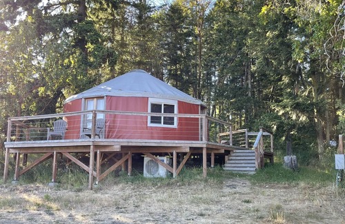 A glamping experience in large yurt located at edge of wooded area. Located just outside Port Townsend. Yurt has king size bed, couch, fold away twin bed, refrigerator, microwave, small cooking unit with coffee maker. Yurt has quiet heat pump to provide air conditioning or heating. Deck surrounds half of yurt overlooking estate. Private bathroom with shower is located a short walk away in nearby building.
