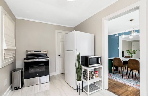 A serene retreat, our mid-century modern home was thoughtfully designed with healthcare workers in mind. The interior features a calming blend of earthy tones with elegant black and gold accents complemented by abundant natural light. Our beautifully renovated two bedroom home is perfectly situated minutes from major hospitals, UMKC, dining, shopping, and attractions. This fully furnished unit offers a comfortable and convenient living experience ideal for professionals, students, and travelers.