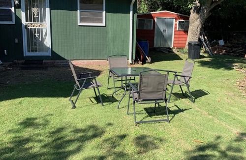 Shared full kitchen, laundry facilities, and lush green backyard (with other guests if present)