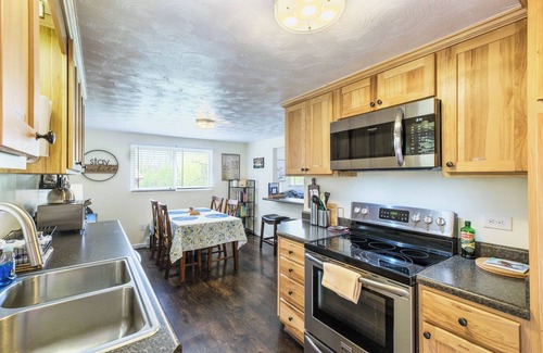 The main level of the home features a fully stocked kitchen, which includes a dishwasher, electric range, built-in microwave, toaster over & air fryer, coffee station, dining area, and bar top seating that looks through the living room to the great outdoors. A Smart TV and sound bar offer streaming apps for your entertainment. 3 comfy bedrooms welcome our guests, which feature quality mattresses and linens, luggage racks, charging ports and more. The Full Bath on this level has plenty of linens, a dispenser for shampoo, conditioner & body wash, as well as storage.