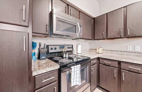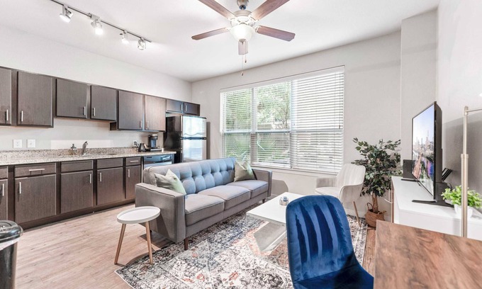 Our 580 sqft 1-bedroom king suite apartment comes standard with a fully-stocked kitchen, dedicated work space, comfy couch, pickleball court, courtyard w/ grills, washer and dryer, fast wifi, & 24-hour gym to accommodate you in the modern times.