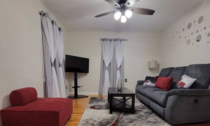 Enjoy this 2-bedroom 1 bath stylish home. You'll have the entire house to yourself located on a quiet street. On site parking with 2 car driveways with back yard and outdoor sitting where smoking is allowed. Just 7 minutes from Lambert Airport. 15-20 minutes away from all STL's attractions. Located close to dining, shopping, parks, and easy access to highways 70,170 &270. Black out curtains, 4 Smart Tv's with highspeed Wi-Fi, and a workstation. Washer and dryer on site with folding area.