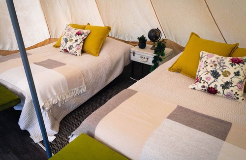 Tent Includes: Double Mattress, Bed Frame, Linens, Pillows, Solar Lights, Side Tables, Seating, Lino Flooring, Decorative Rugs, and other Intricate Decorative Details