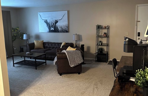 Welcome to this delightful apartment in Massillon. This fabulous rental features 2 cozy bedrooms with queen beds, perfect for a small group of guests. Enjoy the convenience of amenities like AC, WiFi, and a hair dryer during your stay. With a charming bathroom and a location that offers easy access to the city's attractions and highways leading to nearly anywhere in 15 minutes, this brilliant apartment is the ideal home base for your Massillon adventure be it business or personal. Enjoy the convenience of location and the peace and quiet along with everything you need for your stay ! From the fully furnished living room complete with Smart Tv, Alexa and personal desk area, to the complete kitchen with all utensils, appliances including ice maker along with a coffee and wine bar! The two bedrooms are ample sized with full dressers, night stands, device charges, luxury mattress and pillows, extra bedding , fans and of course room darkening drapes! You will find the bathroom clean and ready with fresh linens as well. We welcome the opportunity to make your stay more comfortable than home! This unit is nestled just blocks from downtown Massillon in a quiet and well maintained neighborhood, with grocery and dollar stores plus dining and an ice cream shop a block away in addition to all the entertainment venues within minutes along with major highway access just over a mile away making it convenient and travel friendly for work, play or venturing out for dinner, a winery, historical sites and museums, Pro football HOF, local establishments, shopping and more! Your hosts are always available and ready to answer questions and be helpful to insure your stay with us leaves you wanting to return.